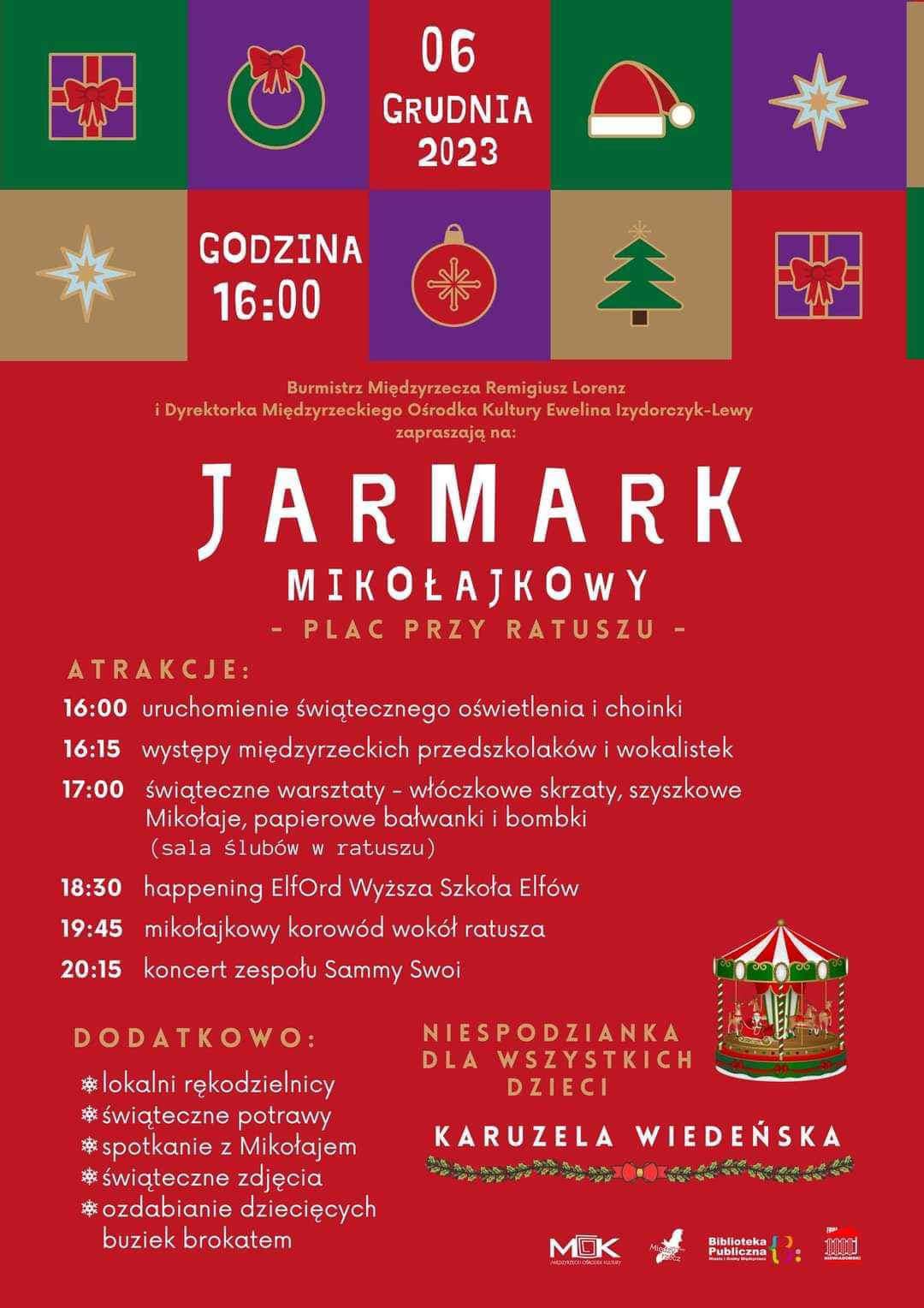 Burmistrz Międzyrzecza Remigiusz Lorenz i dyrektor Międzyrzeckiego Ośrodka Kultury Ewelina Izydorczyk-Lewy zapraszają Mieszkańców na Jarmark Mikołajkowy.