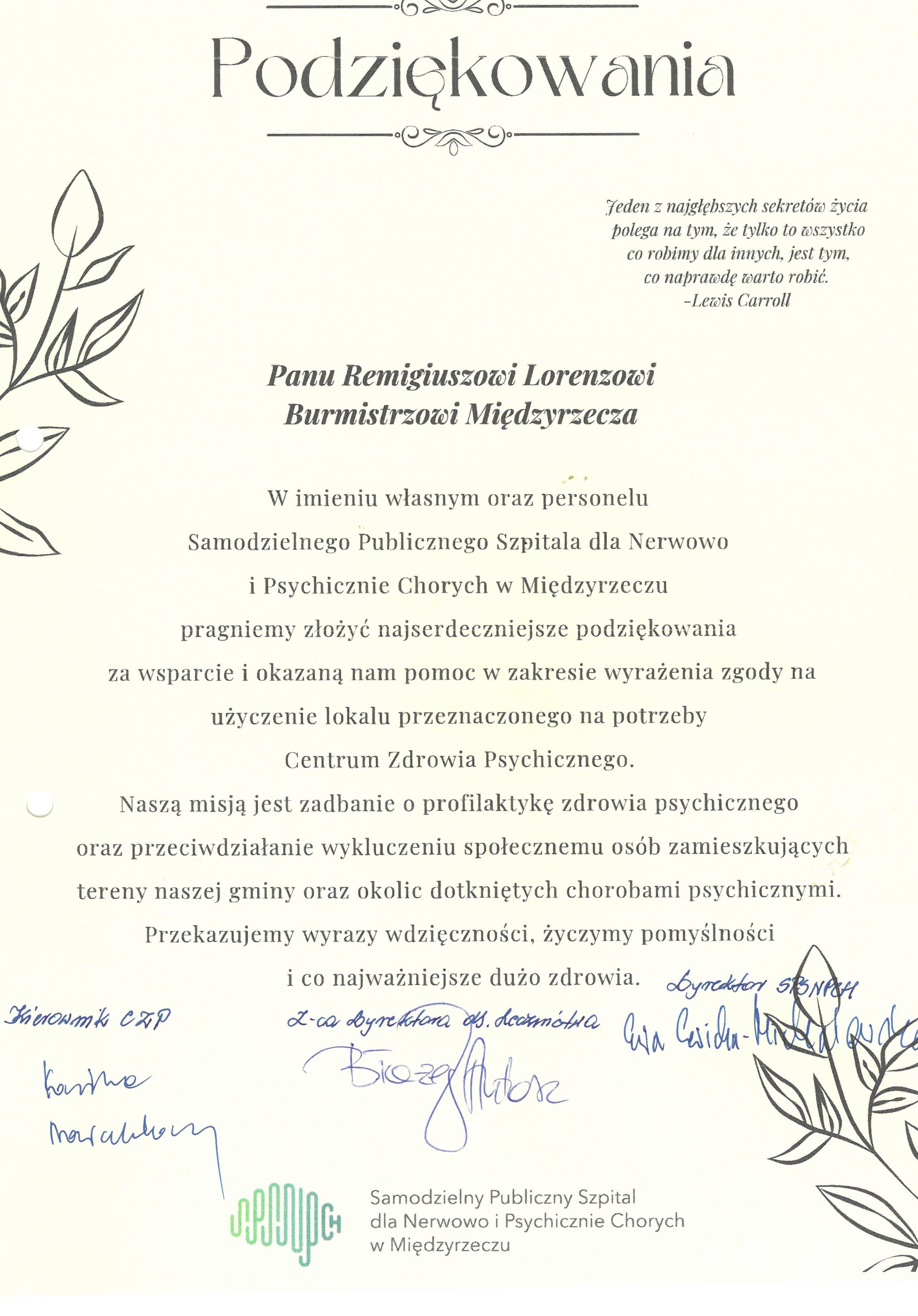 „W imieniu własnym oraz personelu Samodzielnego Publicznego Szpitala dla Nerwowo i Psychicznie Chorych w Międzyrzeczu pragniemy złożyć najserdeczniejsze podziękowania Burmistrzowi Międzyrzecza Panu Remigiuszowi Lorenzowi oraz Radnym Rady Miejskiej w Międzyrzeczu za wsparcie, okazane serce i pomoc w zakresie wyrażenia zgody na użyczenie lokalu oraz przyznania środków na remont i modernizację lokalu przeznaczonego na potrzeby Centrum Zdrowia Psychicznego.