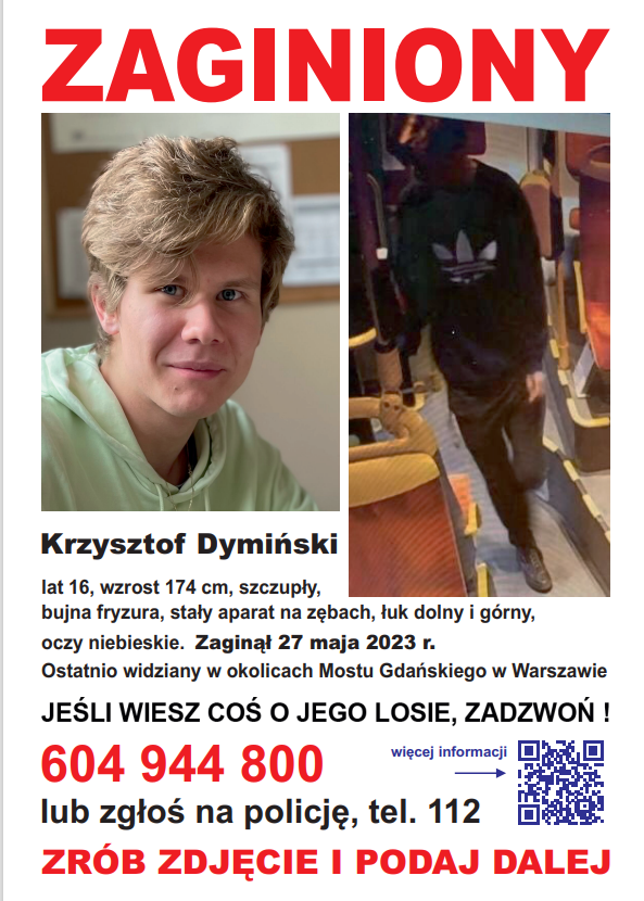 Od kilku miesięcy poszukiwany jest zaginiony Krzysztof Dymiński, lat 16. Wyszedł z domu 27.05.23 roku. Krzysztof może w tym momencie przebywać w każdym miejscu na terenie całej Polski.