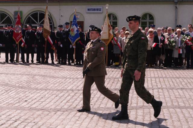 Główne uroczystości, zgodnie z ceremoniałem wojskowym, z udziałem kompanii honorowej 17. WBZ odbyły się tradycyjnie na placu przy Pomniku Tysiąclecia Państwa Polskiego. Rozpoczynając, dowódca uroczystości mjr Marcin Szulewa złożył meldunek przedstawicielowi dowódcy 17.WBZ płk Jarosławowi Mosurowi, po czym przy dźwiękach hymnu RP wciągnięta została flaga na maszt. Okolicznościowe przemówienie wraz z uczniami Szkoły Podstawowej nr 2 i nr 3 Julią Dajworską i Jakubem Skrzekiem wygłosił burmistrz Remigiusz Lorenz. Rozpoczął słowami powszechnie znanej pieśni pt. „Witaj majowa jutrzenko”, która w pełni oddaje znaczenie tego święta. Zaznaczył, że „...konstytucja uchwalona 3 maja 1791 roku, gruntownie zmieniając ustrój Rzeczypospolitej, ówczesnym obywatelom dawała nadzieję na przemiany. W tym trudnym momencie wzbudzała ducha patriotyzmu, dodając sił do próby naprawy sytuacji politycznej i geopolitycznej, w jakiej znajdowała się ówczesna Polska”. Tuż po przemówieniu Apel Pamięci odczytała por. Weronika Milczarczyk, po czym wydano komendę do salwy honorowej. Tradycyjnie, delegacje reprezentujące różne środowiska zawodowe i społeczne złożyły kwiaty pod pomnikiem. Krótki występ artystyczny zaprezentował Międzyrzecki Chór Kameralny oraz harcerze z 2. DH „Iskry” i 22. DH „Krzesiwo”. Na zakończenie dowódca uroczystości wydał komendę do defilady. Po uroczystościach mieszkańcy mogli oglądnąć i zrobić sobie zdjęcie z KTO Rosomak.