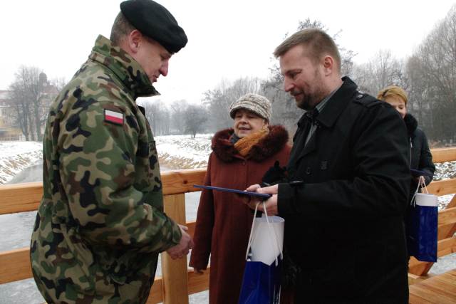 Kładka wybudowana została przez saperów z 4. Batalionu Inżynieryjnego z Głogowa, których podczas otwarcia reprezentował ppłk Adam Kliszka. Burmistrz serdecznie podziękował za zaangażowanie, pomoc oraz dobrą współpracę. Słowa wdzięczności skierował również do wojewody Katarzyny Osos i starosty Grzegorza Gabryelskiego, którzy poparli starania burmistrza.