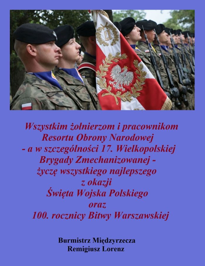 Z okazji Święta Wojska Polskiego i 100. rocznicy Bitwy Warszawskiej burmistrz Remigiusz Lorenz życzy wszystkiego najlepszego żołnierzom i pracownikom cywilnym Resortu Obrony.