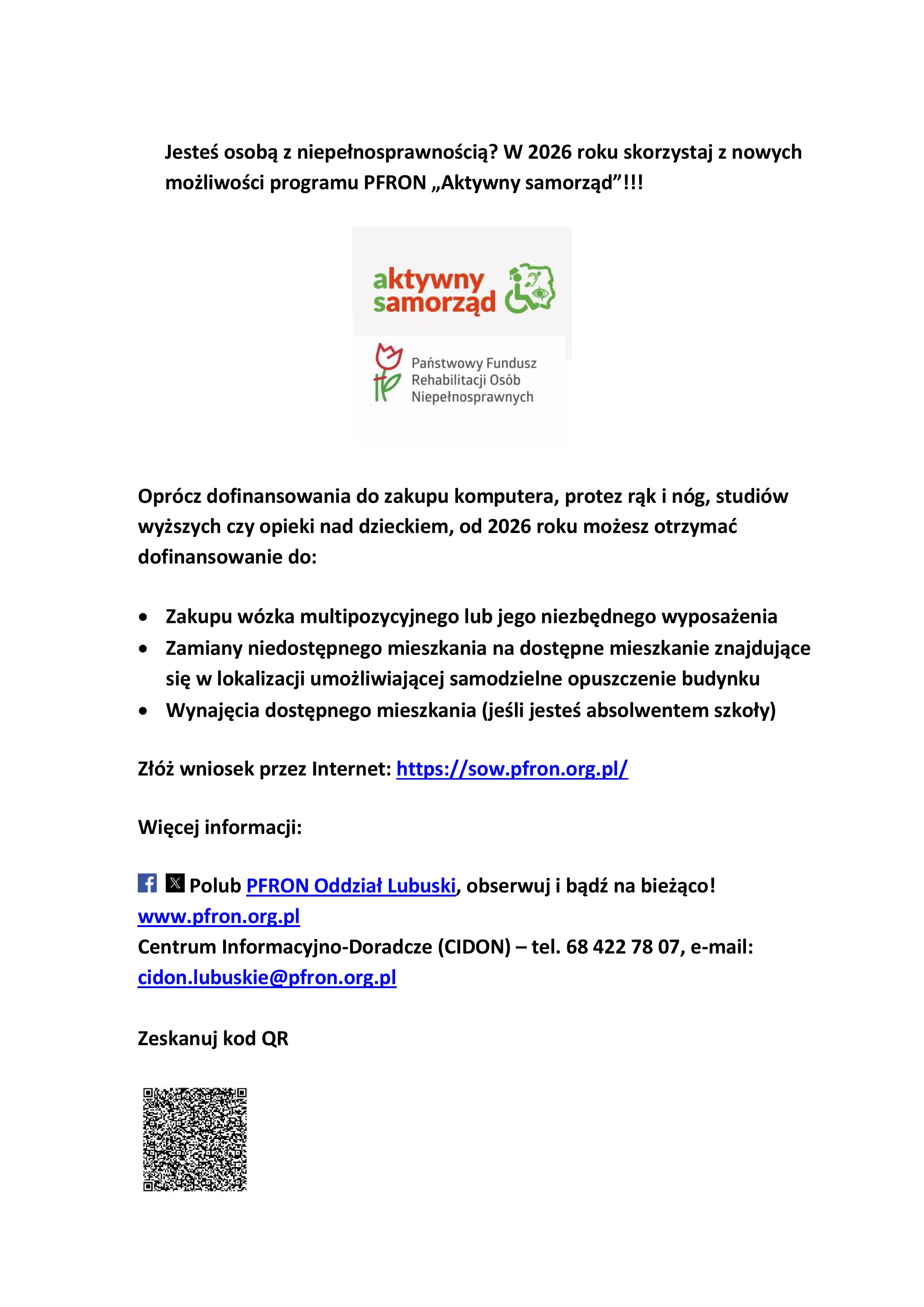 Więcej informacji: Polub PFRON Oddział Lubuski, obserwuj i bądź na bieżąco! www.pfron.org.pl