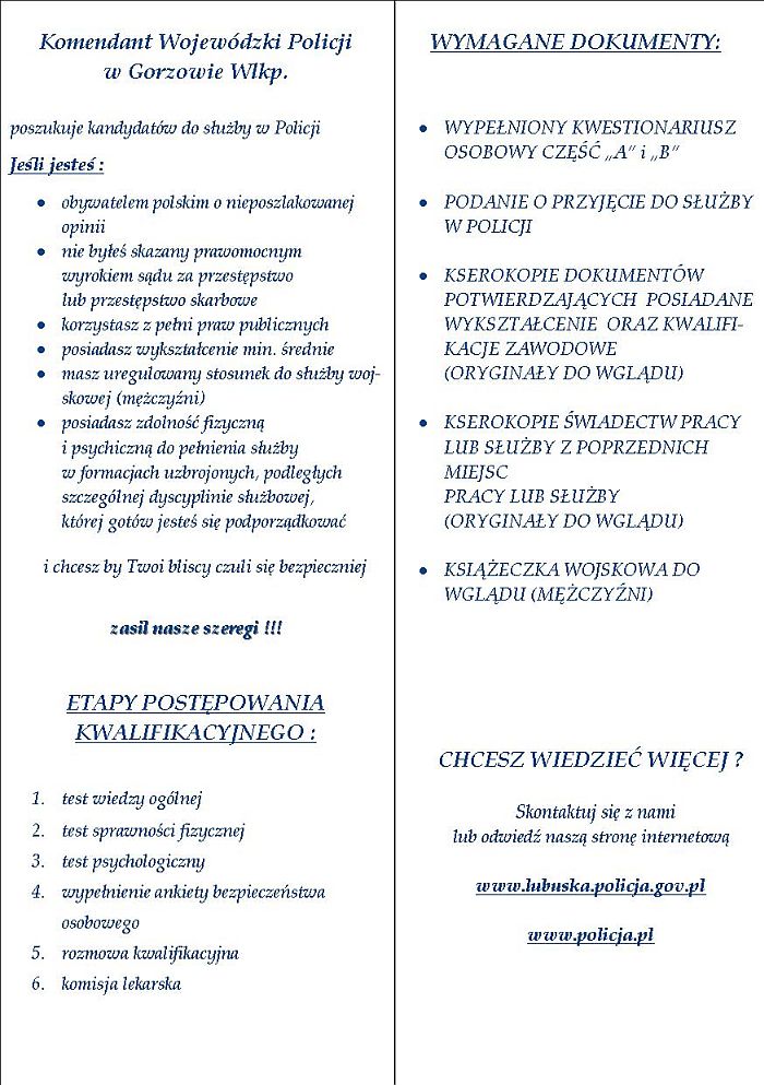 Komendant Wojewódzki Policji w Gorzowie Wlkp. poszukuje chętnych do pracy w policji . Szczegóły na plakatach.
