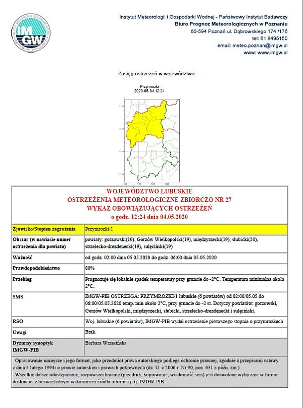 Uwaga: Ostrzeżenie przed przymrozkami!