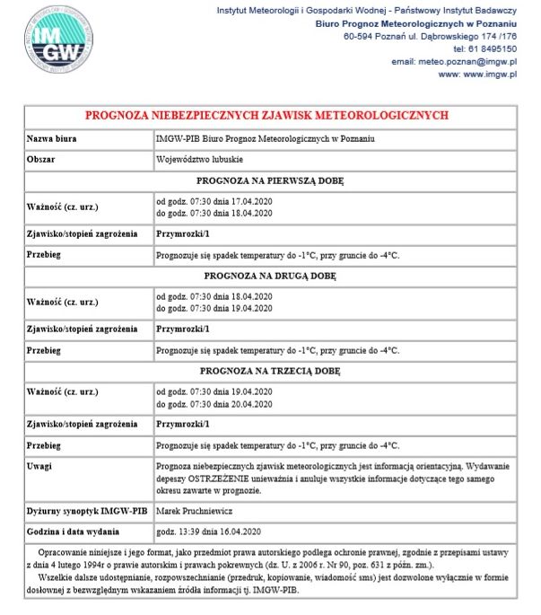 Ostrzeżenie przed przymrozkami w dniach od 17 do 20 kwietnia.
