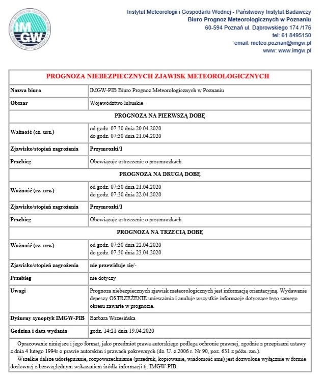 Ostrzeżenie przed przymrozkami w dniach od 20 do 22 kwietnia