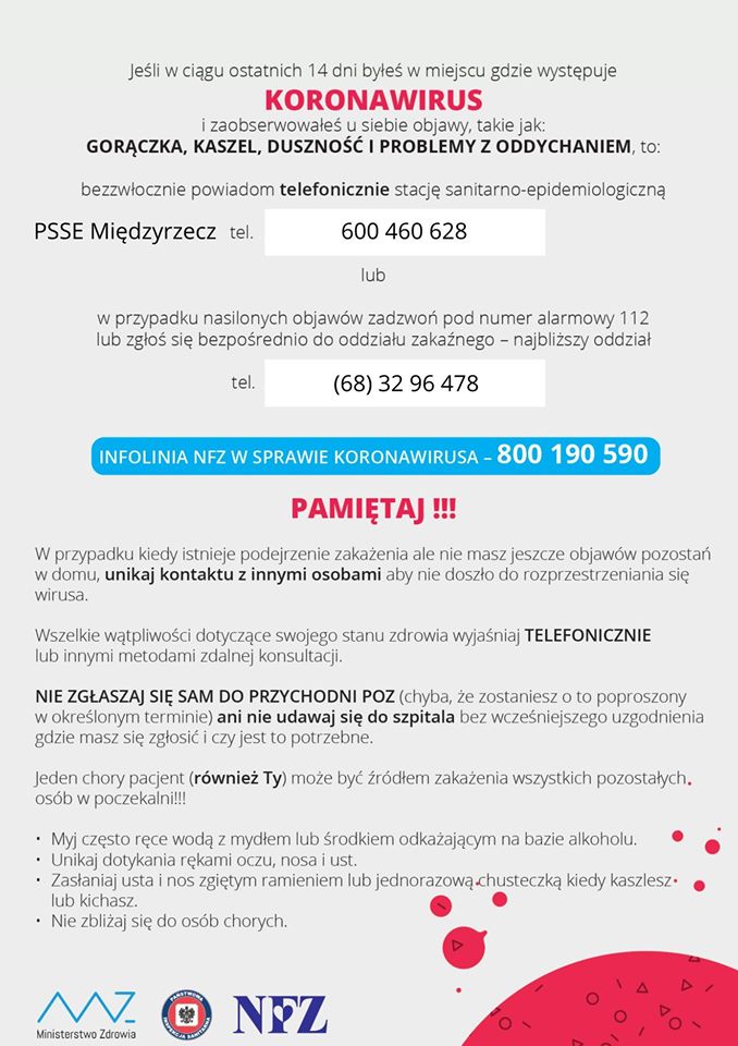 Jeśli w ciągu ostatnich 14 dni byłeś w miejscu, gdzie występuje koronawirus i zaobserwowałeś u siebie objawy, takie jak gorączka, kaszel, duszności i problemy z oddychaniem, bezzwłocznie powiadom telefonicznie stację sanitarno-epidemiologiczną PSSE w Międzyrzeczu: 600 460 628.