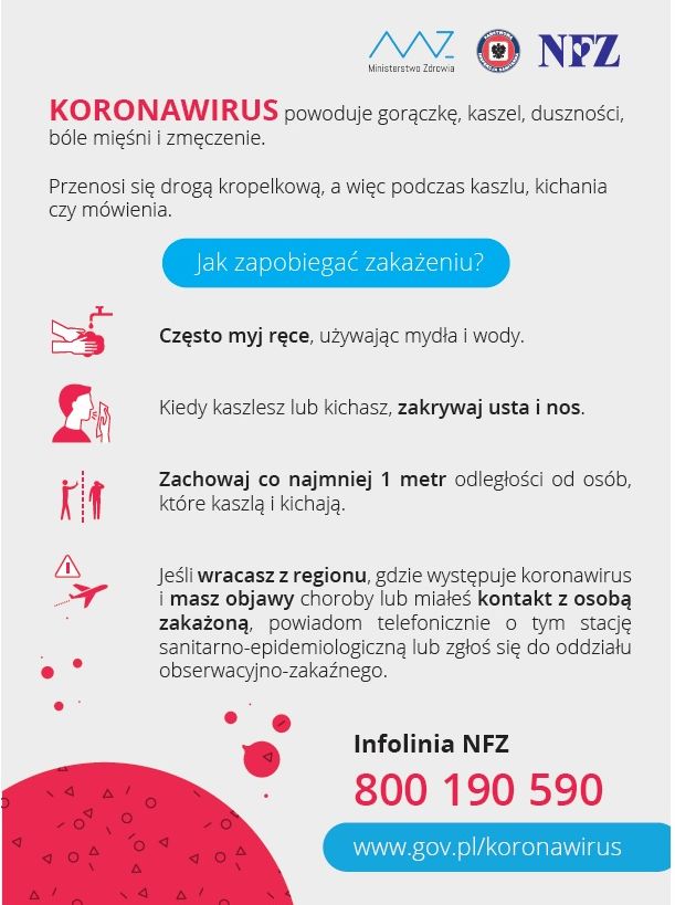 W związku z rozprzestrzenianiem się coronawirusa COVID-19 w Europie i rosnącym niepokojem społeczeństwa wywołanym jego możliwymi skutkami, informujemy, że wszelkie informacje dotyczące coronawirusa znajdują się na stronie internetowej Ministerstwa Zdrowia (https://www.gov.pl/web/zdrowie) w zakładce Co musisz wiedzieć o Koronawirusie. (https://www.gov.pl/static/code//co-musisz-wiedziec-o-koronawirusie.html)
