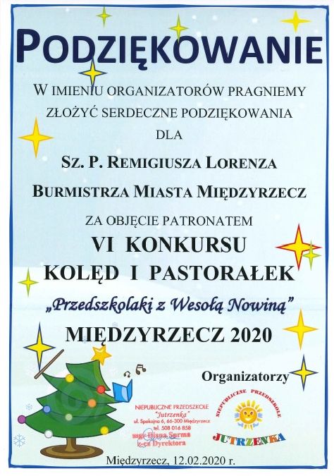 Podziękowanie dla burmistrza Międzyrzecza Remigiusza Lorenza za objęcie patronatem VI Konkursu Kolęd i Pastorałek, który odbył się w przedszkolu Jutrzenka.