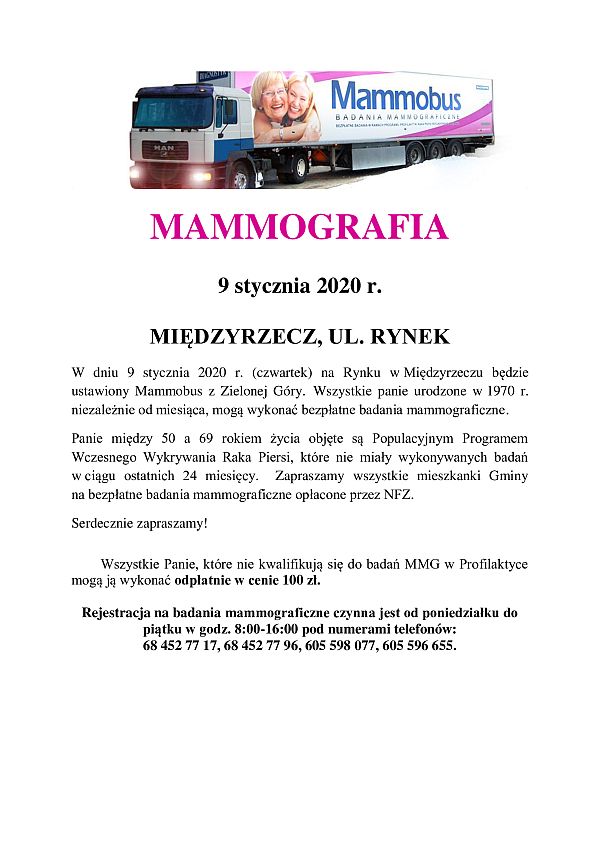 W czwartek, 9 stycznia, na rynku koło ratusza zaparkuje specjalny mammobus, w którym wykonywane będą badania mammograficzne.