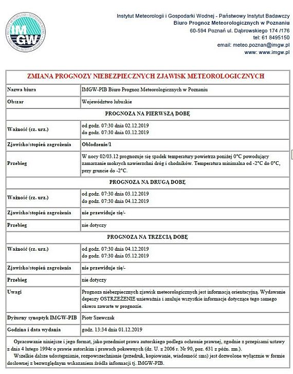 Instytut Meteorologii i Gospodarki Wodnej ostrzega przed niebezpiecznym zjawiskiem meteorologicznym - spadkiem temperatury i oblodzeniem od wtorku od godz. 7.30 do środy do godz. 7.30.