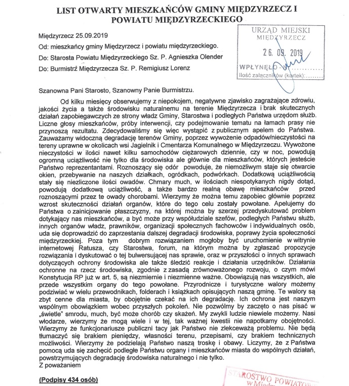 Do Urzędu Miejskiego wpłynął List Otwarty Mieszkańców w sprawie uciążliwego dla nich odoru, związanego z wywożeniem na pola w okolicach wsi Jagielnik osadów z oczyszczalni ścieków w Gorzowie Wlkp. Pod listem podpisały się 434 osoby.