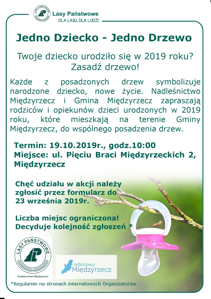Z okazji 95 rocznicy Lasów Państwowych Nadleśnictwo Międzyrzecz przyłączyło się do ogólnopolskiej akcji „Jedno dziecko – jedno drzewko”. Parterem leśników jest w niej Gmina Międzyrzecz.