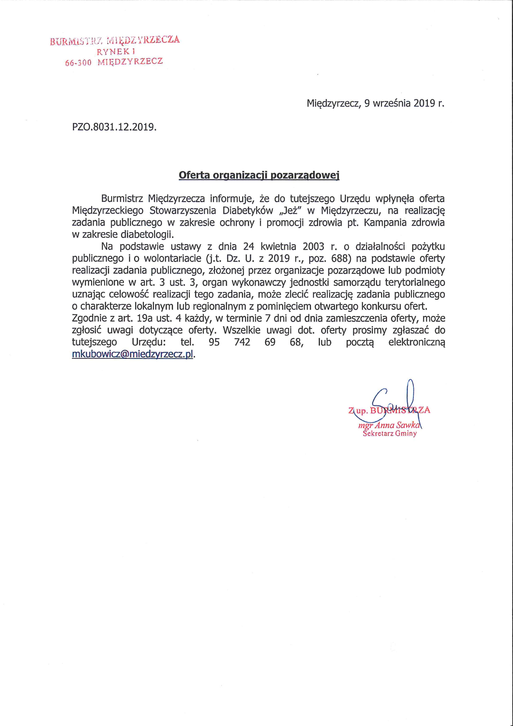 Burmistrz Międzyrzecza informuje o wpłynięciu oferty Międzyrzeckiego Stowarzyszenia Diabetyków "Jeż" w Międzyrzeczu na realizację zadania publicznego w zakresie ochrony i promocji zdrowia pt. Kampania zdrowia w zakresie diabetologii.