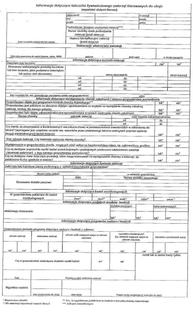 Powiatowy Lekarz Weterynarii w Międzyrzeczu przekazuje aktualny wzór druku przekazany z Głównego Inspektoratu Weterynarii dotyczący łańcucha żywnościowego zwierząt kierowanych do uboju.