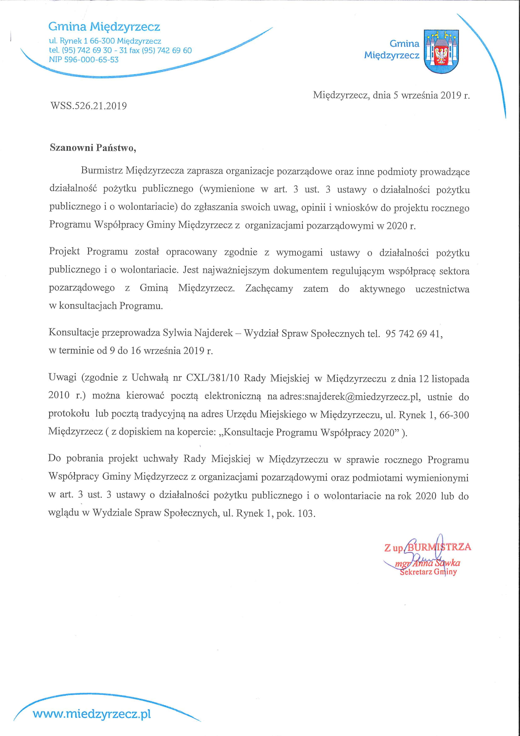 Komunikat ws. projektu rocznego Programu Współpracy Gminy Międzyrzecz z organizacjami pozarządowymi w 2020 r.
