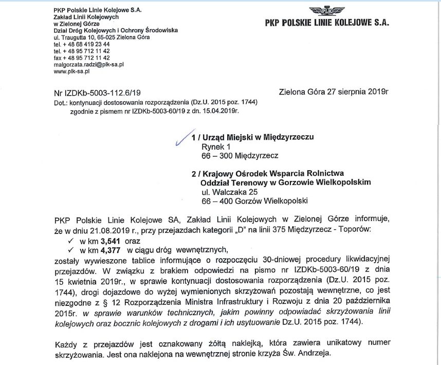 PKP Polskie Koleje Państwowe SA, Zakład Linii Kolejowych w Zielonej Górze informuje o rozpoczęciu procedury likwidacyjnej przejazdów kolejowych na linii Międzyrzecz-Toporów.