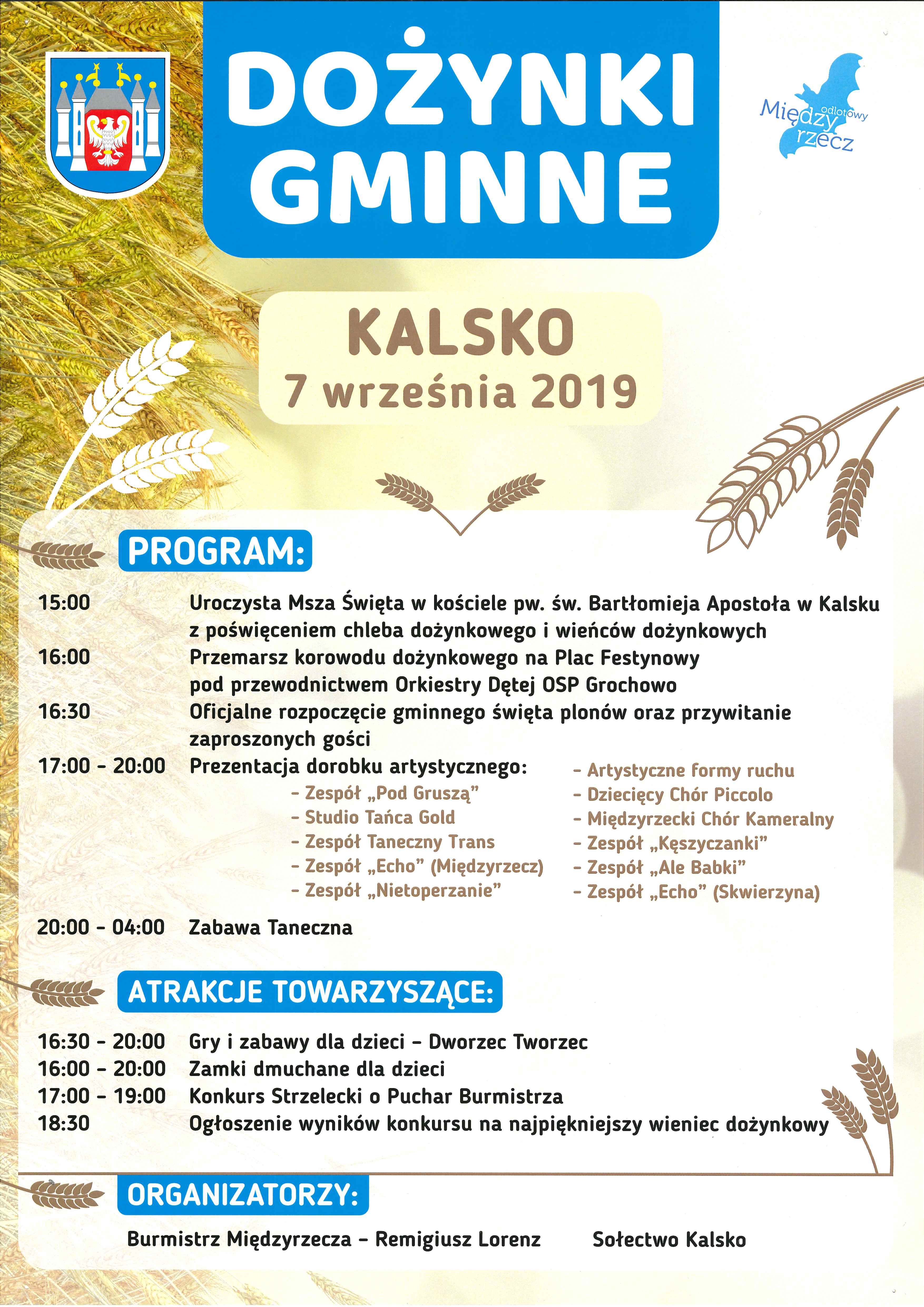 Burmistrz Międzyrzecza, Remigiusz Lorenz oraz Sołtys Kalska, Mariusz Sieratowski, zapraszają na obchody Dożynek Gminnych, które odbędą się 7 września 2019 roku.