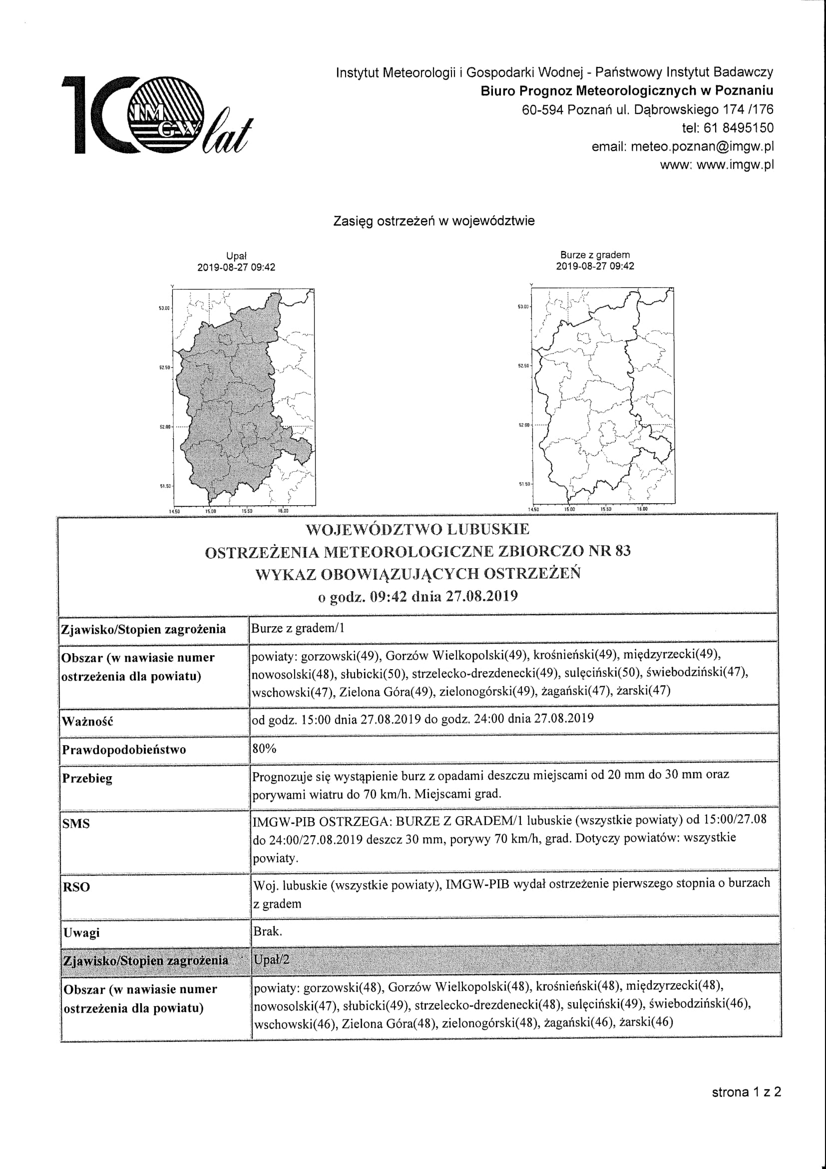 Instytut Meteorologii i Gospodarki Wodnej ostrzega przed 80% prawdopodobieństwem wystąpienia burz z opadami deszczu od 20 mm do 30 mm oraz porywami wiatru do 70 km/h (miejscami grad!) dziś od godz. 15:00 do 24:00.