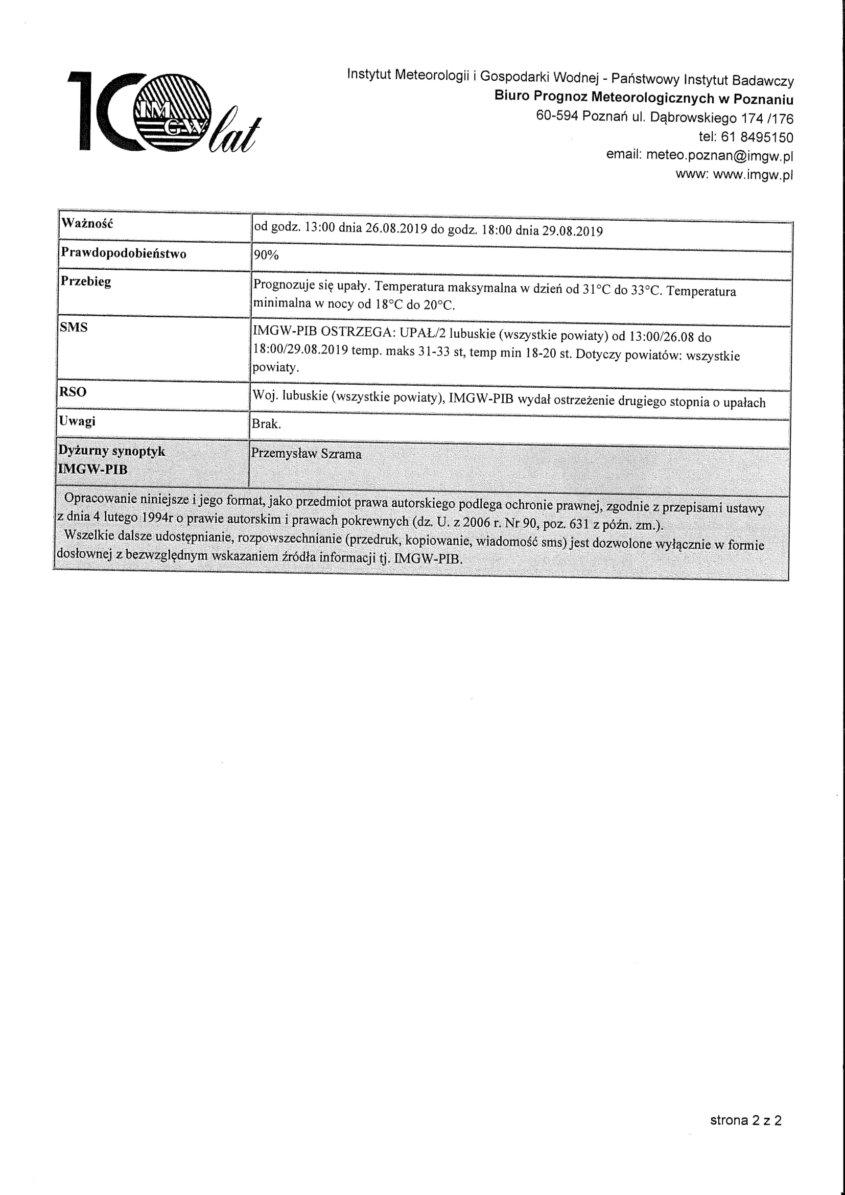 Dodatkowo IMGW ostrzega przed upałem od 26.08 do 29.08. Temperatura maksymalna w dzień 31°C do 33°C.
