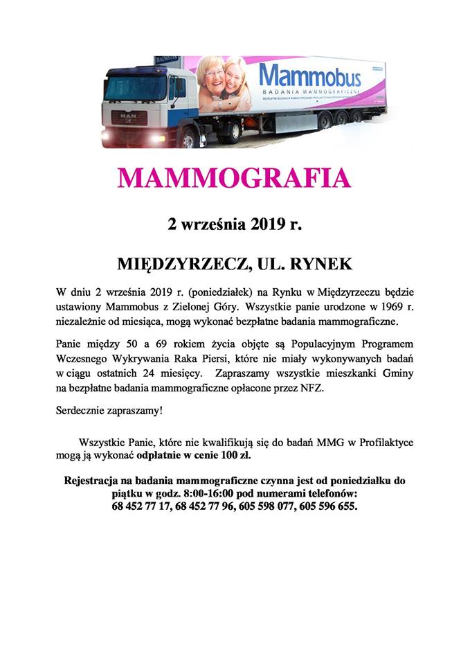 W poniedziałek 2 września, przy budynku ratusza w Międzyrzeczu ustawiony będzie Mammobus, w środku którego prowadzone będą bezpłatne badania mammograficzne.