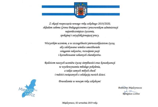 Życzenia burmistrza Remigiusza Lorenza dla nauczycieli, pracowników administracyjnych szkół i uczniów z okazji rozpoczęcia nowego roku szkolnego 2019-2020.