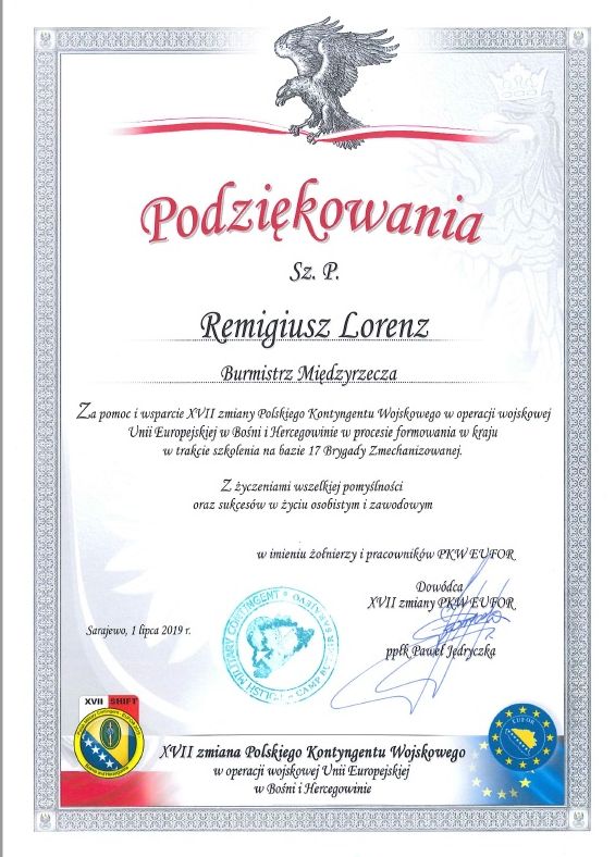 Burmistrz Międzyrzecza Remigiusz Lorenz otrzymał podziękowanie od żołnierzy 17. Wielkopolskiej Brygady Zmechanizowanej za pomoc i wsparcie XVII zmiany Polskiego Kontyngentu Wojskowego w operacji wojskowej Unii Europejskiej w Bośni i Hercegowinie.