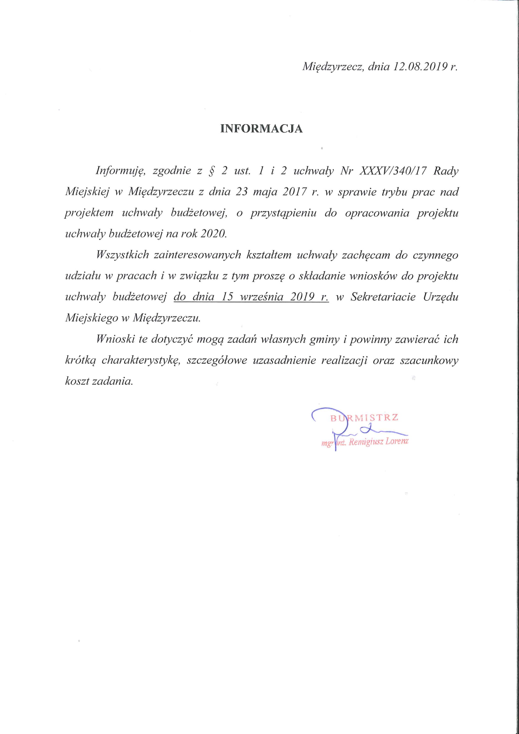 Burmistrz miasta Międzyrzecz, Remigiusz Lorenz, informuje o przystąpieniu do opracowania projektu uchwały budżetowej na rok 2020.