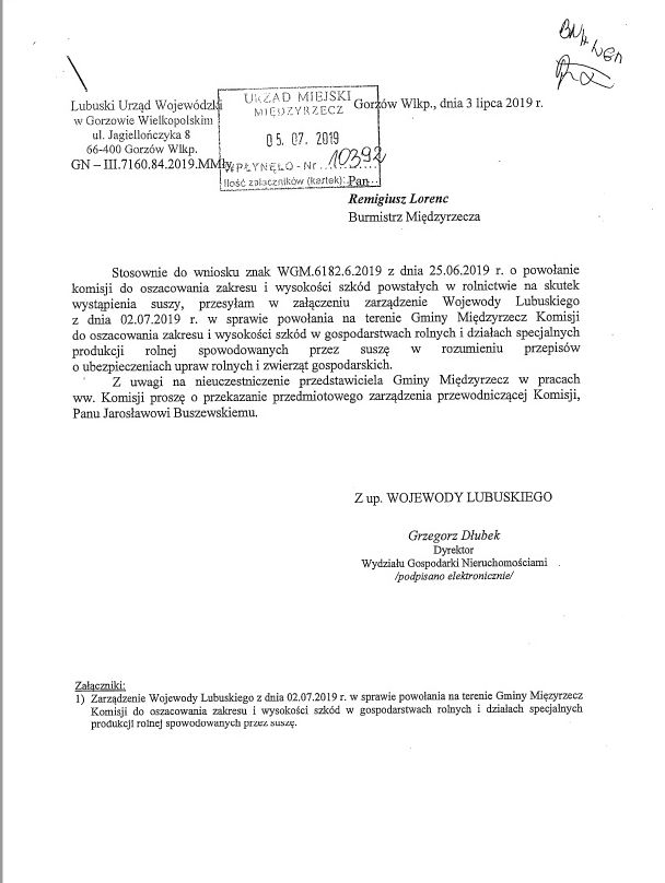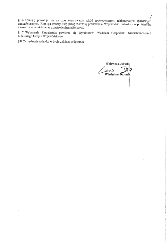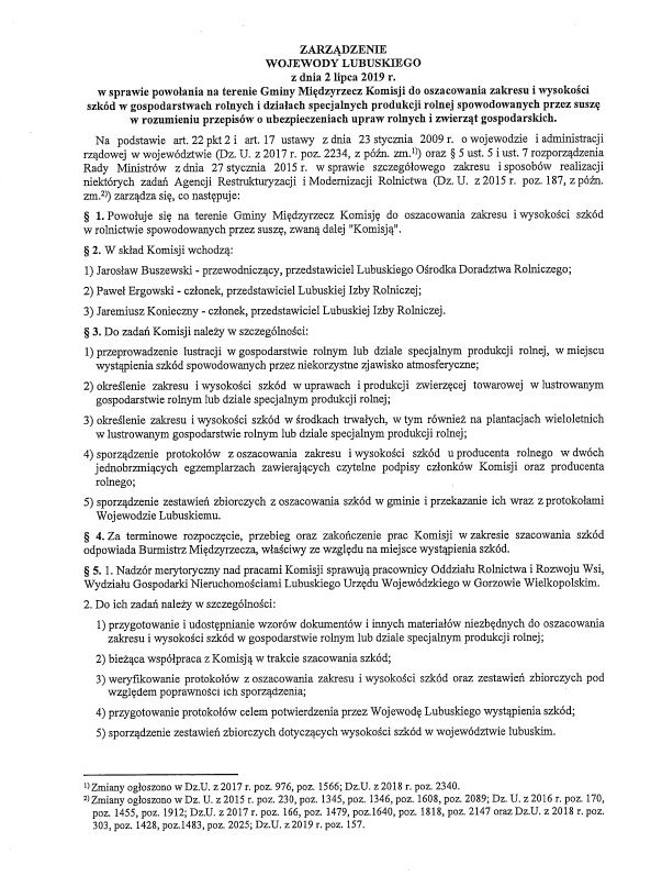 Zarządzenie wojewody lubuskiego w sprawie powołania na terenie gminy Komisji do szacowania zakresu i wysokości szkód w gospodarstwach rolnych i działach specjalnych produkcji rolnej spowodowanych przez suszę.