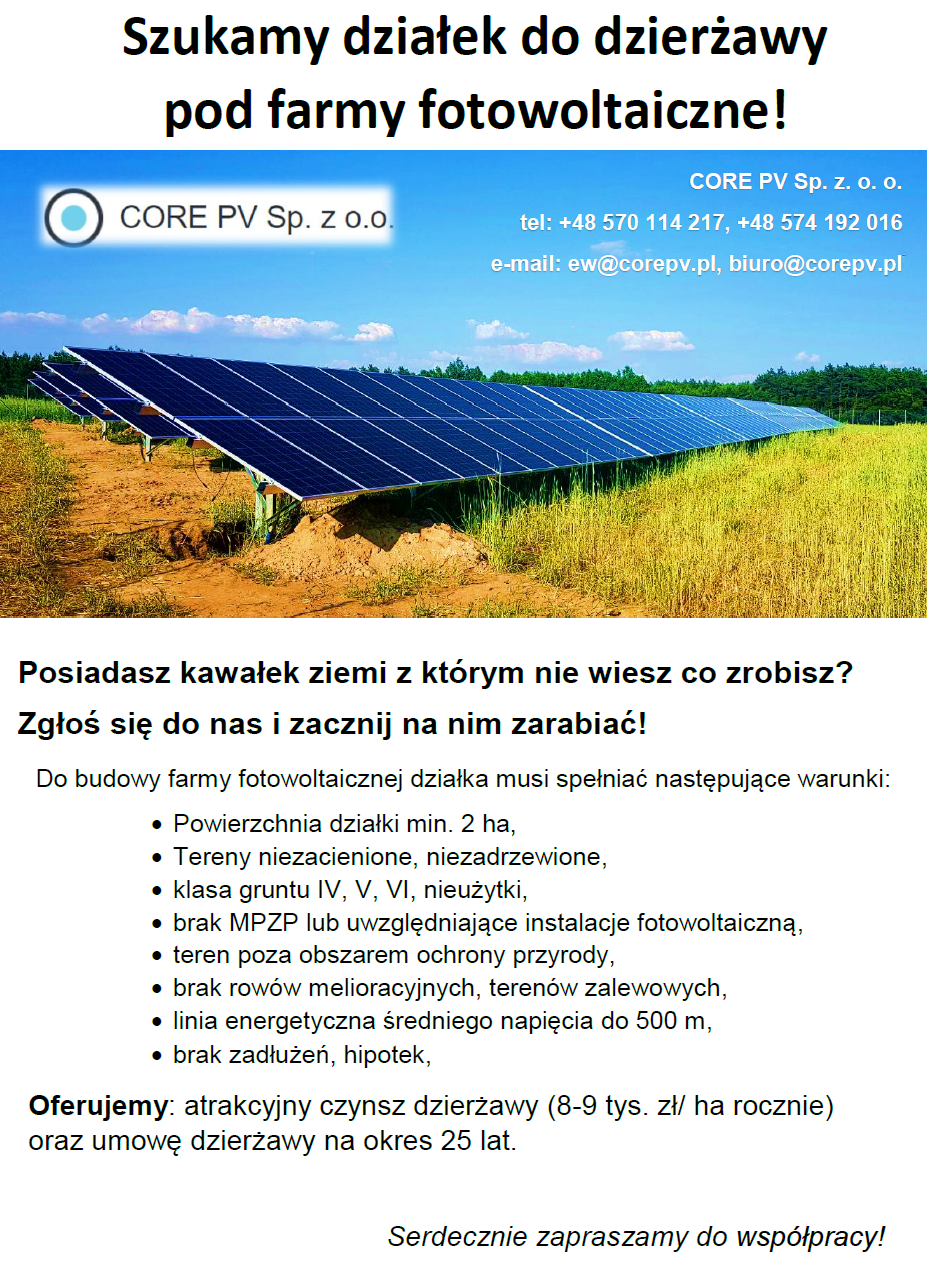 Na prośbę firmy CORE PV Sp. z o.o. publikujemy informację: