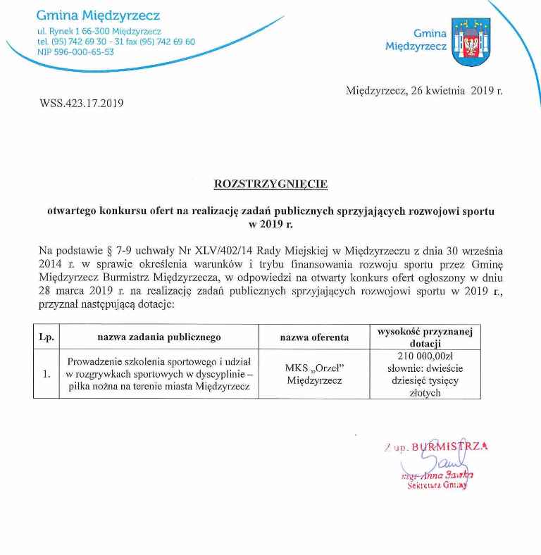 Rozstrzygnięcie otwartego konkursu ofert na realizację zadań publicznych sprzyjająceych rozwojowi sportu w 2019 r.