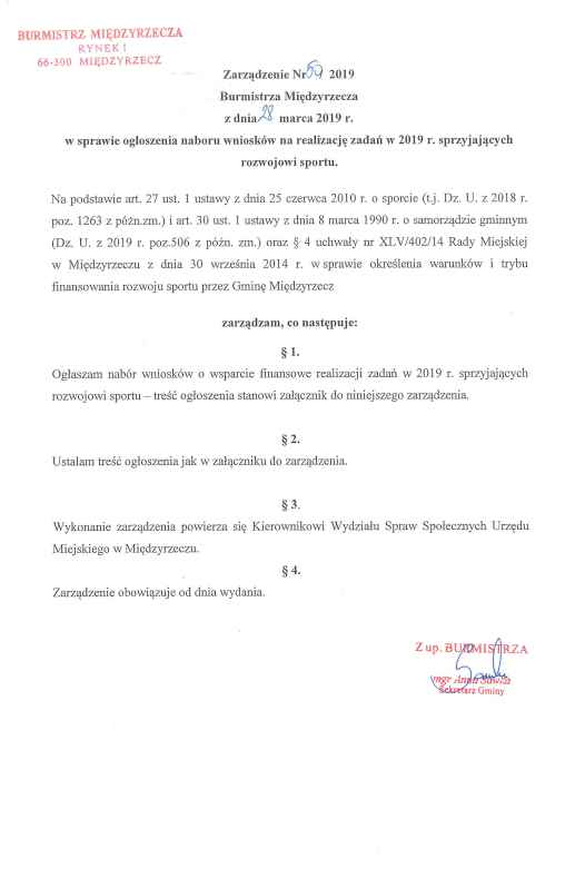 Zarządzenie Burmistrza Międzyrzecza w sprawie ogłoszenia naboru wniosków na realizację zadań sprzyjających rozwojowi sportu w 2019 r.