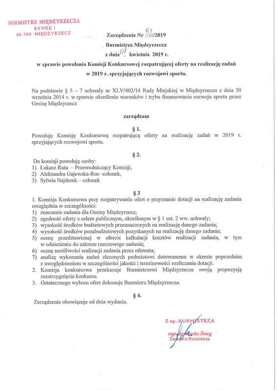 Zarządzenie Burmistrza Międzyrzecza w sprawie powołania Komisji Konkursowej rozpatrującej oferty na realizację zadań w 2019 r. sprzyjających rozwojowi sportu