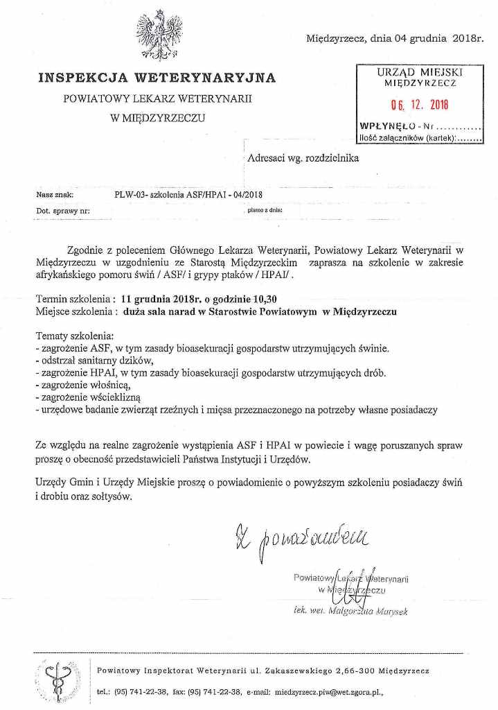 Zaproszenie na szkolenie w zakresie afrykańskiego pomoru świń/ASF/grypa ptaków /HPAI