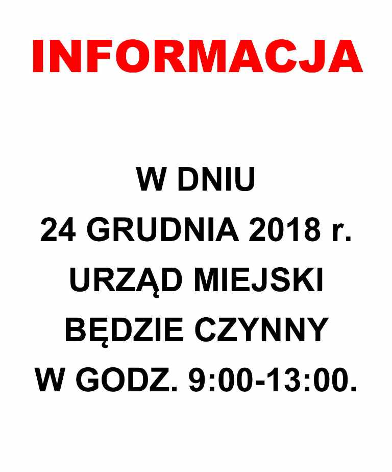 Informacja o godzinach pracy Urzędu Miejskiego w dniu 24.12.2018
