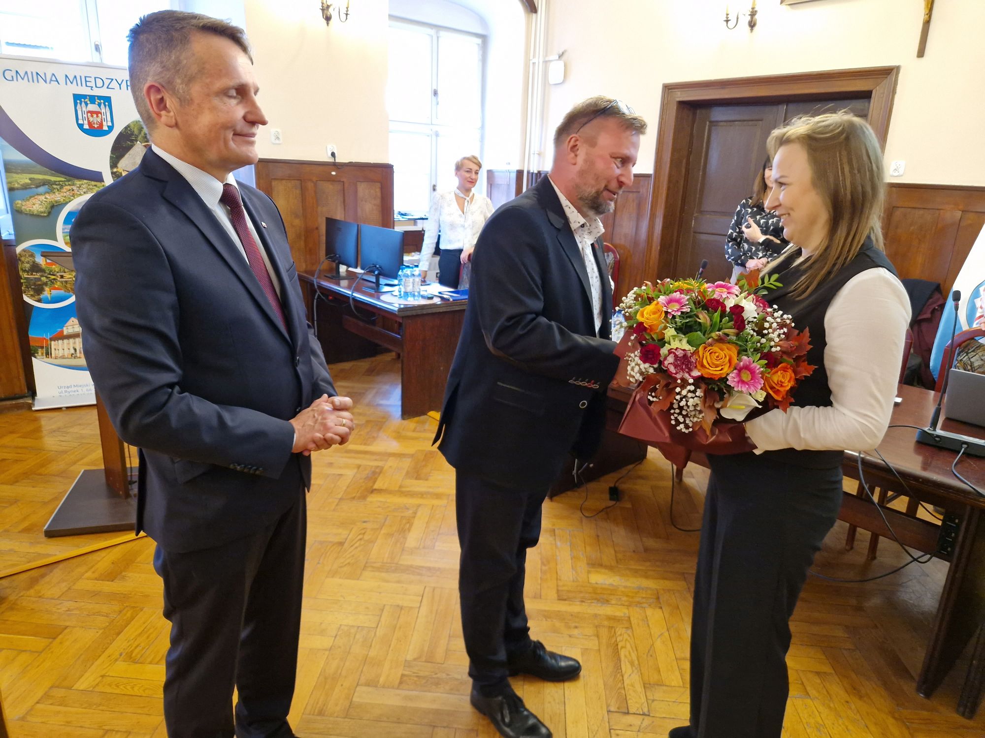 Burmistrz i przewodniczący wręczyli I. Korejwo bukiet kwiatów, a L. Lorenz także przypinkę z herbem gminy. Kolejny bukiet wręczyli jej następczyni Kamili Zep, której życzyli sukcesów zawodowych i spełnienia w życiu osobistym.