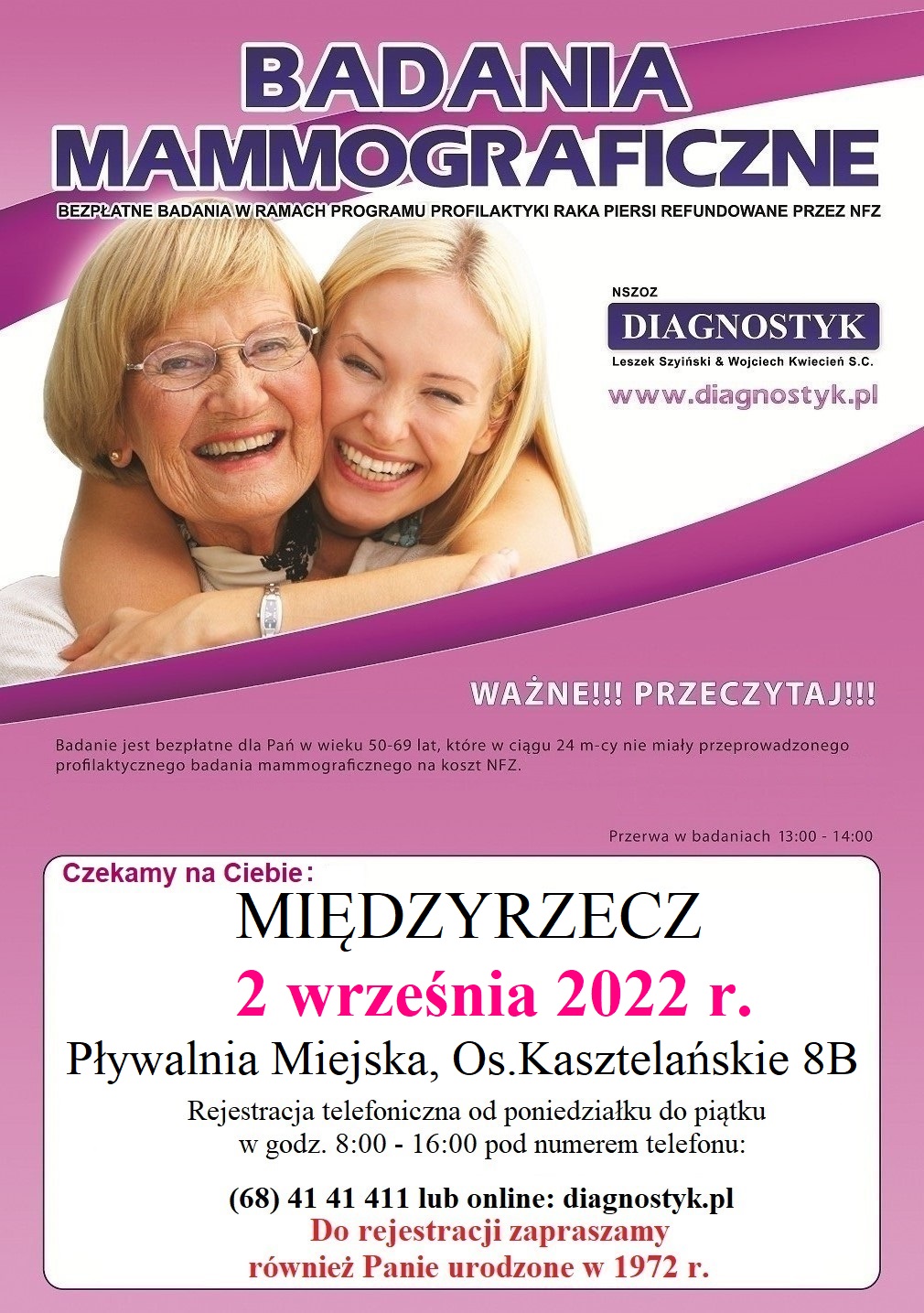 Badania odbędą się w piątek, 2 września, w specjalnym mammobusie na parkingu przed krytą pływalnią Kasztelanka.