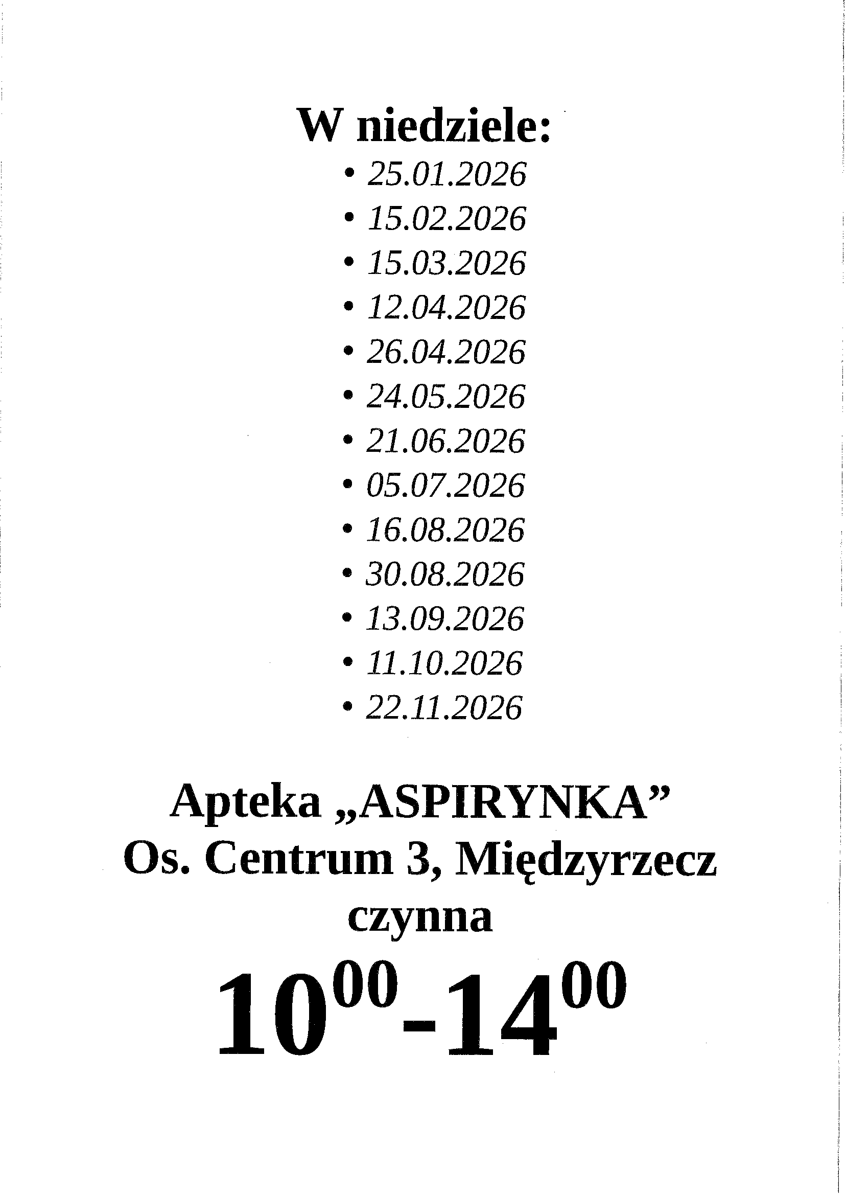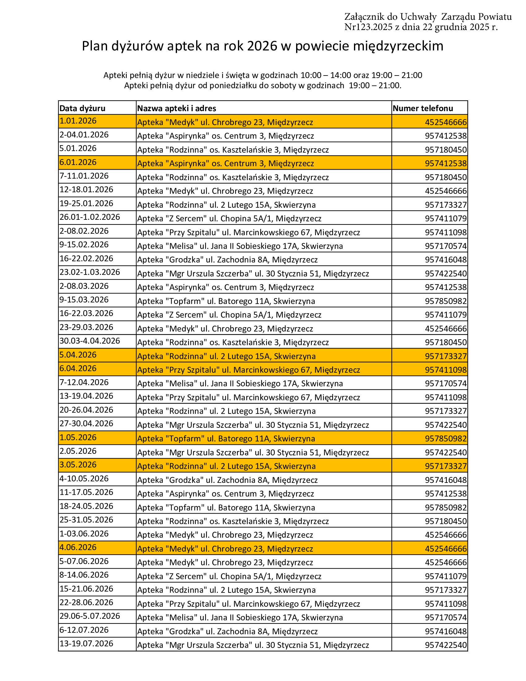 Uchwała Zarządu Powiatu w Międzyrzeczu z dnia 22 grudnia 2025 r. w sprawie określenia rozkładu godzin pracy aptek ogólnodostępnych na terenie powiatu międzyrzeckiego w dni wolne od pracy oraz w porze nocnej w 2026 roku.