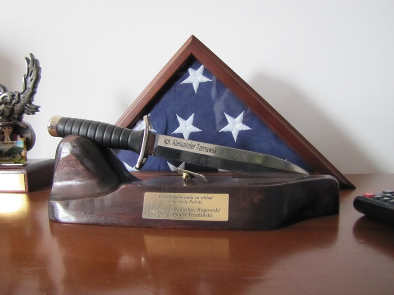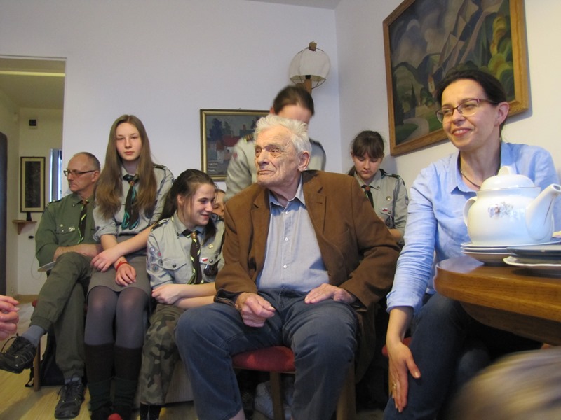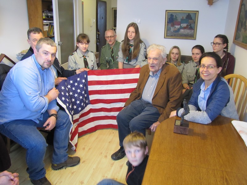 Po oficjalnym spotkaniu cała grupa została zaproszona przez żonę pana A. Tarnawskiego, panią Elżbietę, na poczęstunek do ich mieszkania. I tutaj dalszy ciąg pytań o przeszłość naszego Bohatera. Mogliśmy także zobaczyć pamiątkowe statuetki i list gratulacyjny od Dowództwa Gromu. W zbiorach pana Aleksandra znajduje się także flaga amerykańska, która wisiała w tym roku na Kongresie Stanów Zjednoczonych w dniu jego urodzin.