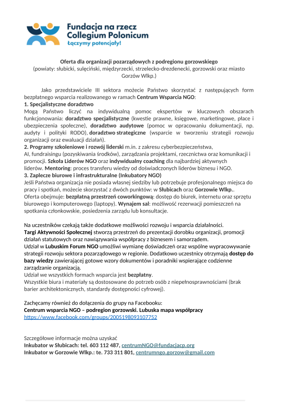 Informacja Fundacji na rzecz Collegium Polonicum na temat bezpłatnego wsparcia, realizowanego w ramach Centrum Wsparcia NGO.