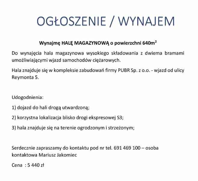 Ogłoszenie o wynajmie hali