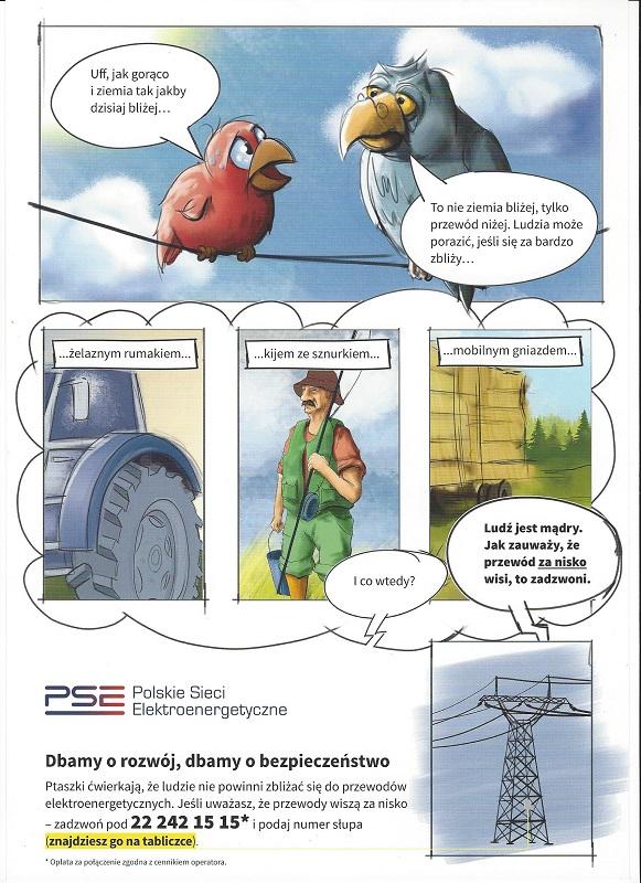 Polskie Sieci Elektroenergetyczne S.A. rozpoczęły kampanię informacyjną, której celem jest podniesienie świadomości osób mieszkających lub pracujących w sąsiedztwie linii przesyłowych oraz promowanie bezpiecznych zachowań. Energia elektryczna w naszym codziennym życiu odgrywa ogromną rolę i przy zachowaniu podstawowych środków ostrożności nie stanowi zagrożenia dla zdrowia i życia ludzi oraz zwierząt. Również w przypadku linii przesyłowych, gdzie napięcie jest znacznie wyższe niż w domowym gniazdku, stosowanie zasad bezpieczeństwa chroni przed ewentualnym porażeniem prądem. Dlatego też jeśli zauważyłeś sytuację niebezpieczną dla zdrowia lub życia ludzkiego (np. nisko zwisające przewody) nie bądź obojętny i zadzwoń na infolinię 22 242 15 15 i podaj numer słupa (znajdziesz go na tabliczce informacyjnej) – być może w ten sposób ratujesz czyjeś życie.