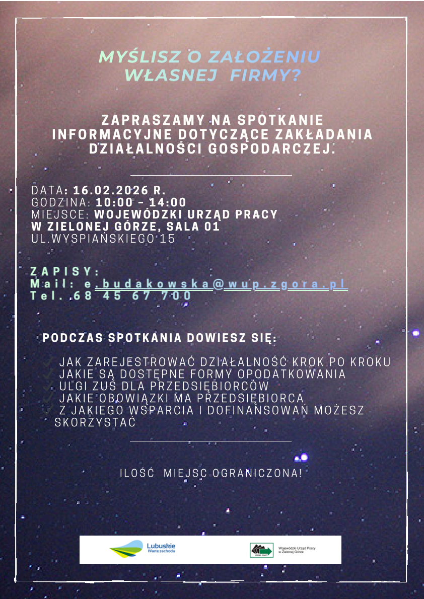 Spotkanie odbędzie się 16 lutego 2026 r. w siedzibie Wojewódzkiego Urzędu Pracy w Zielonej Górze, ul. Wyspiańskiego 15, w godzinach 10.00 - 14.00 i obejmuje takie tematy, jak: