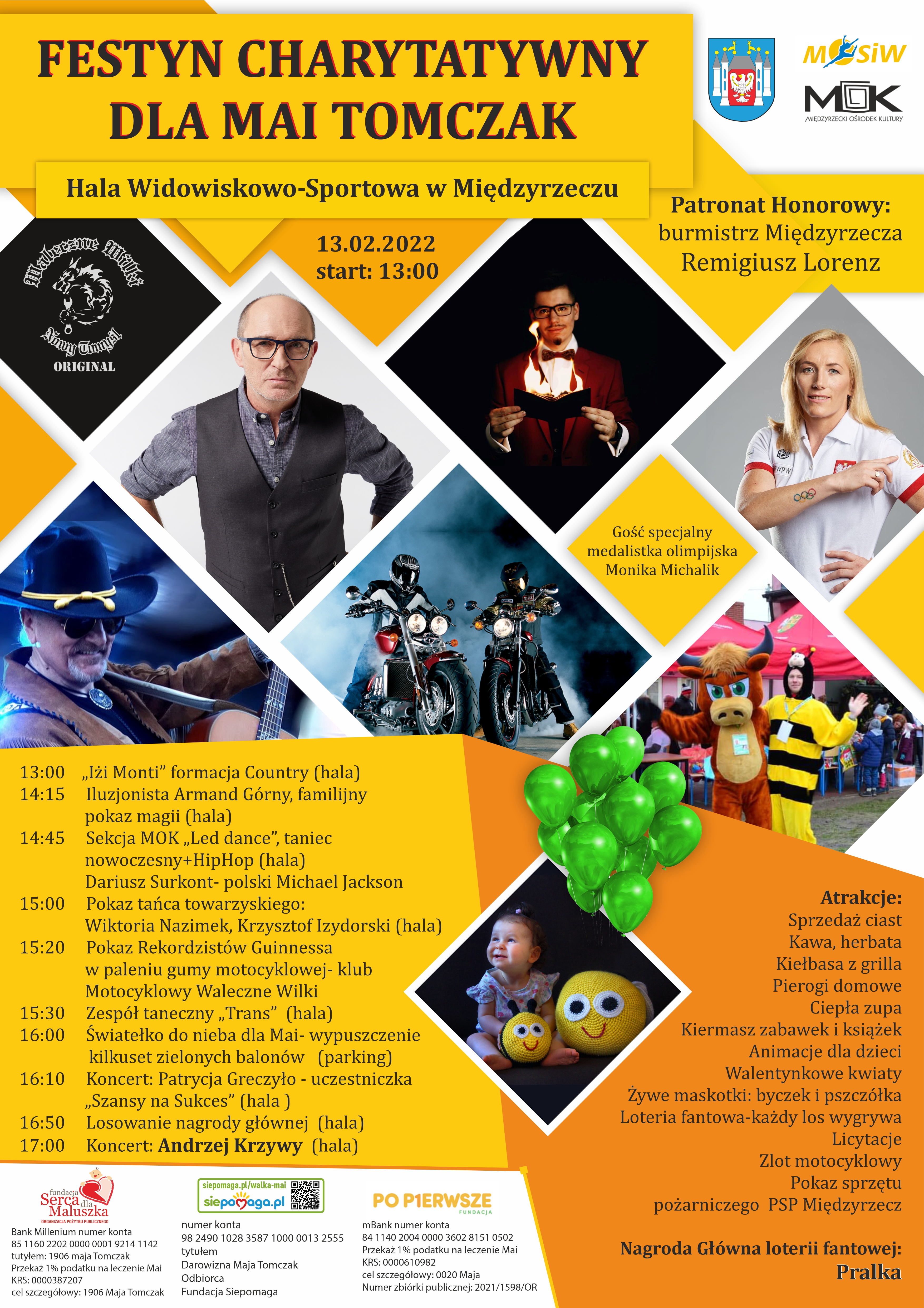 Kiermasze, kulinarne przysmaki, występy artystyczne, pokazy i licytacje – to tylko kilka z licznych atrakcji, przygotowanych dla uczestników festynu przez licznych przyjaciół Mai. W hali występowały m.in. tancerki znanego w regionie Zespołu Tanecznego Trans i z sekcji Led Dance z Międzyrzeckiego Ośrodka Kultury, zespół muzyki country Iżi Monty, uczestniczka Szansy na Sukces Patrycja Greczyło oraz Andrzej Krzywy.