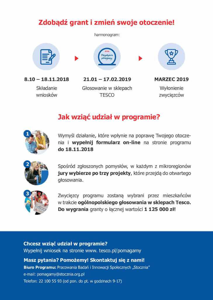 Swoje pomysły można zgłaszać do 18 listopada poprzez formularz zgłoszeniowy znajdujący się na stronie wwww.tesco.pl/pomagamy. W każdym z mikroregionów grantami w wysokości 5000, 3000 i 1000 złotych zostaną narodzone najciekawsze inicjatywy.
