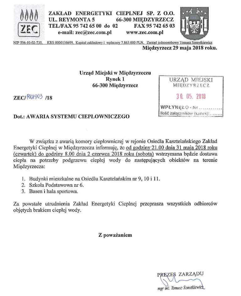 UWAGA MIESZKAŃCY! Awaria systemu ciepłowniczego