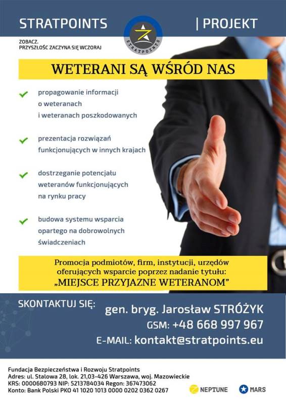 Projekt „Weterani są wśród nas” wprowadzony został przed Fundację Bezpieczeństwa i Rozwoju Stratpoints. Ma on na celu propagowanie informacji o weteranach i weteranach poszkodowanych, prezentację rozwiązań funkcjonujących w innych krajach, dostrzeganie potencjału weteranów funkcjonujących na rynku pracy i budowę systemu wsparcia opartego na dobrowolnych świadczeniach.