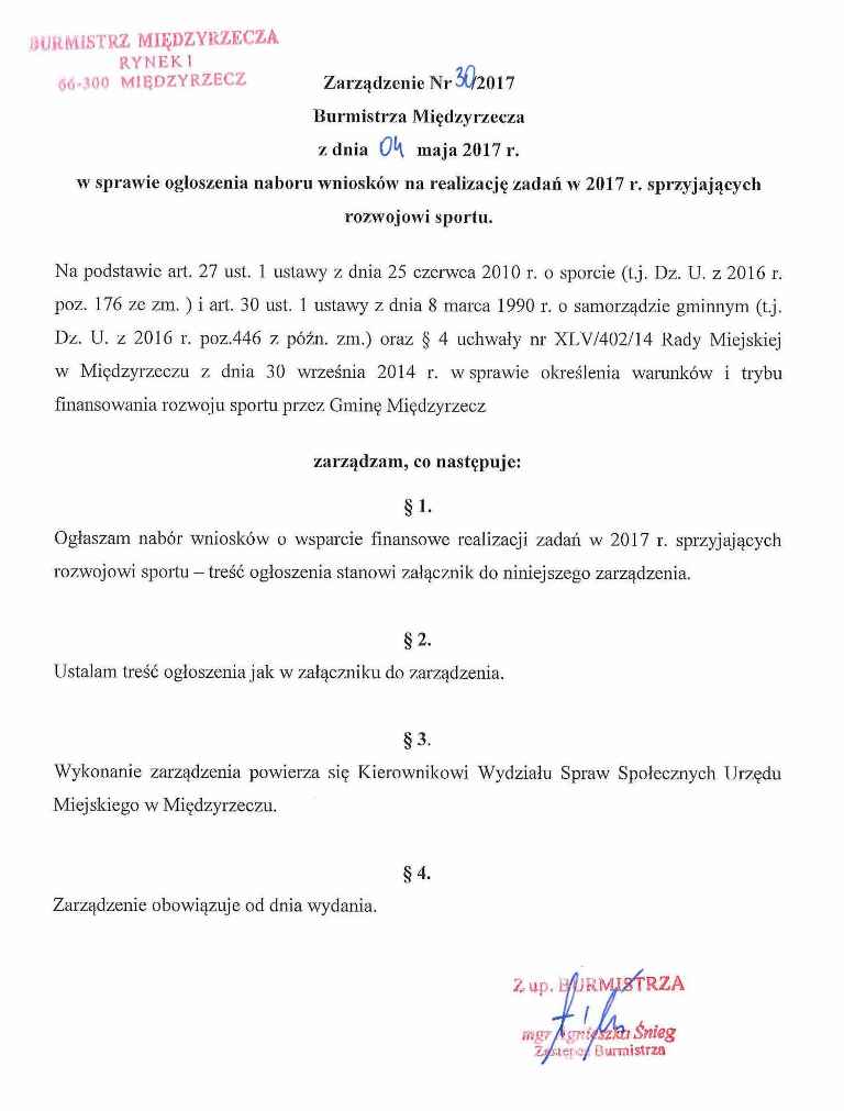 Zarządzenie Burmistrza Międzyrzecza w sprawie ogłoszenia naboru wniosków na realizację zadań sprzyjających rozwojowi sportu w 2017 r.