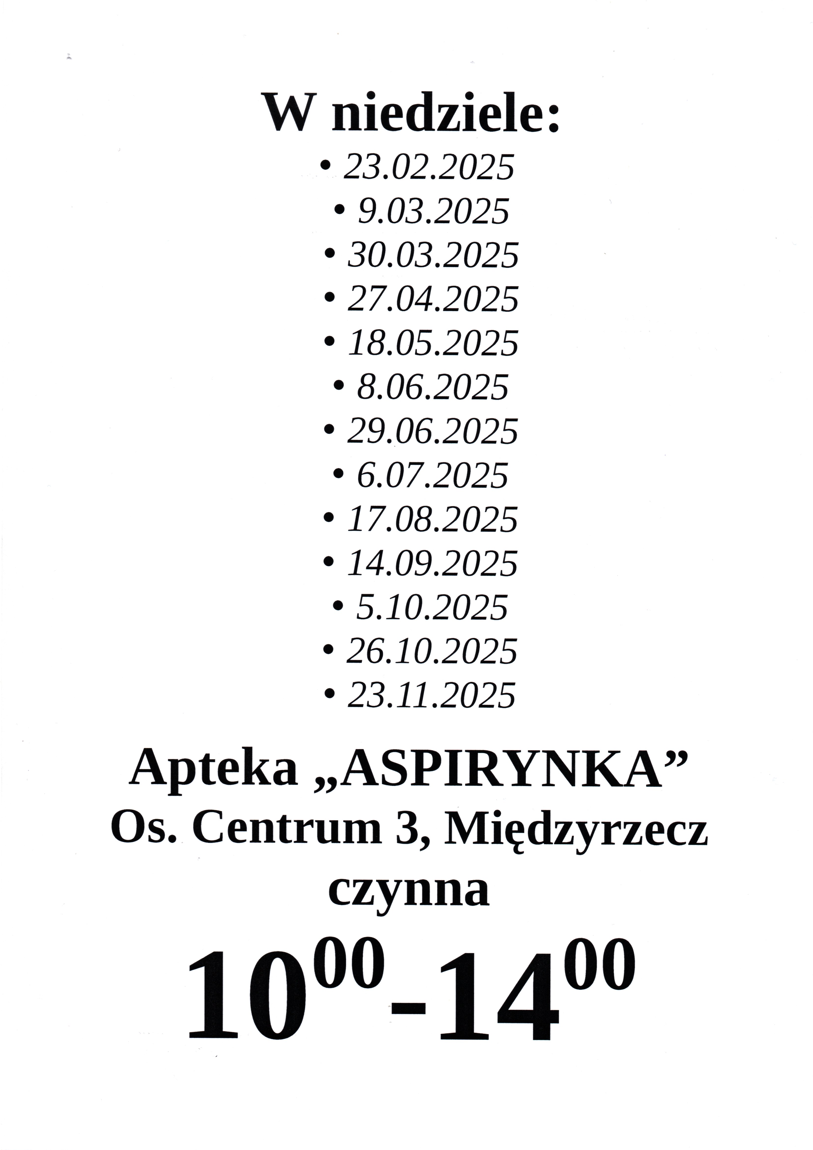 Apteka Aspirynka na os. Centrum 3 przypomina o niedzielnych dyżurach, które prowadzi w godz. od 10,00 do 14.00 .